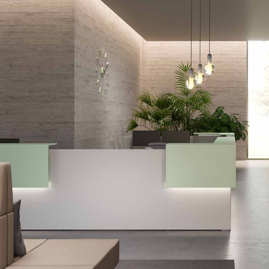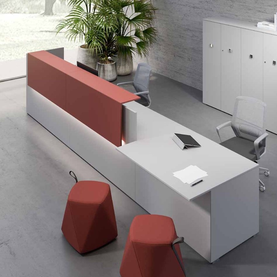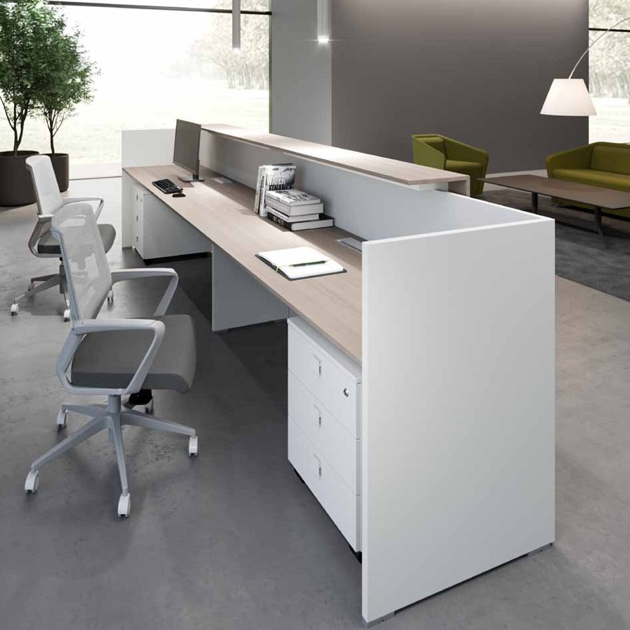 | Specs | The counter body Top is manufactured using 18 mm European origin melamine boards and edge banded with 1.5 mm matching ABS edge banding; top can be provided with high quality grommet box for cables passage, the box can be in Aluminum or ABS. Side panels are manufactured using 25 mm European origin melamine boards and edge banded with 2 mm matching ABS edge banding side panels are connected together with 50 x 20 mm metal beams & aluminum die casting bracket , metal beams are electrostatic powder coated, equipped with ABS glides with regulation of 1.5 cm. The Upper Top Upper Top is available in two options: 18 mm European origin melamine boards with 1.5 mm matching ABS edge banding or 18 mm high-quality MDF painted |