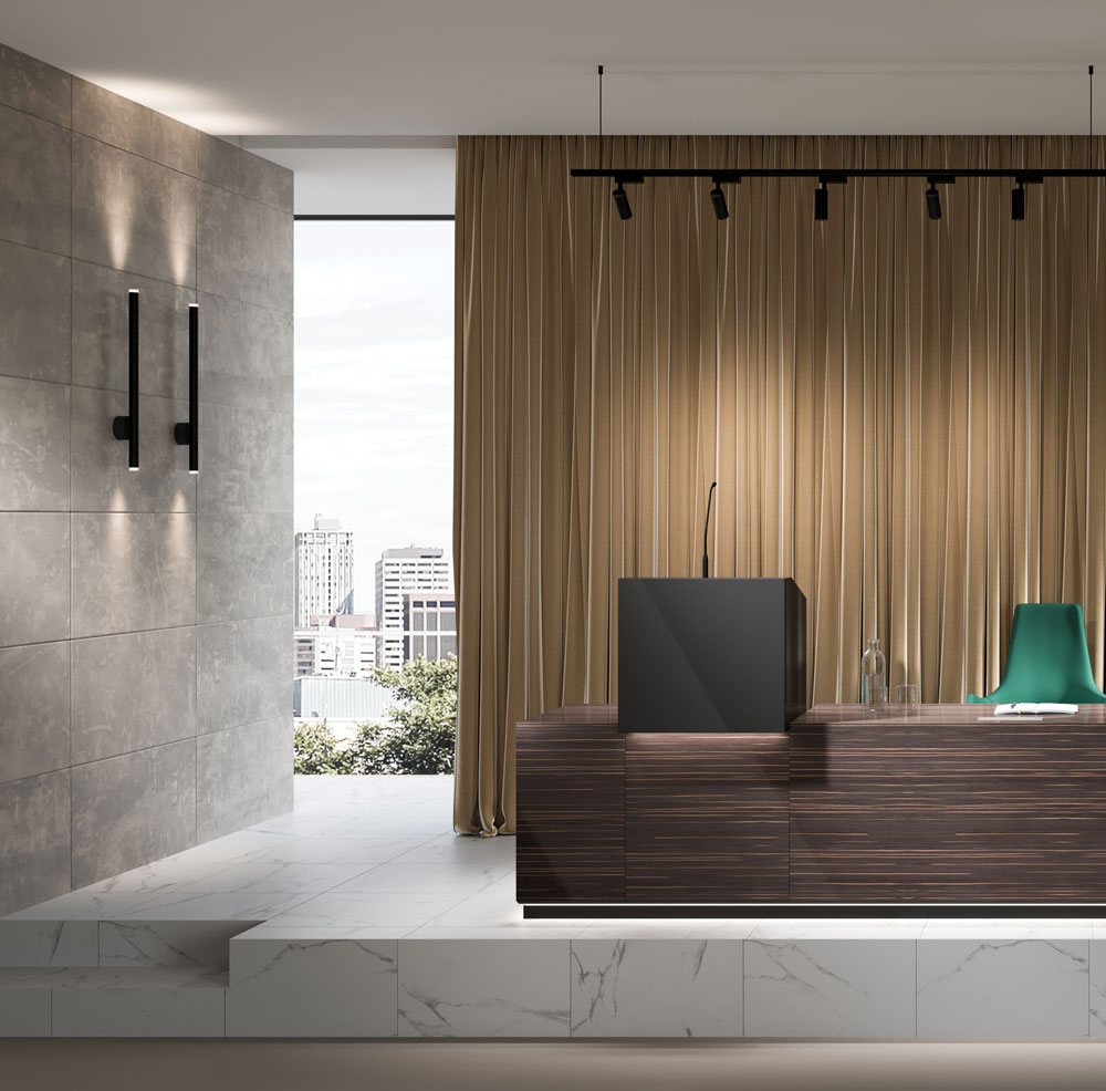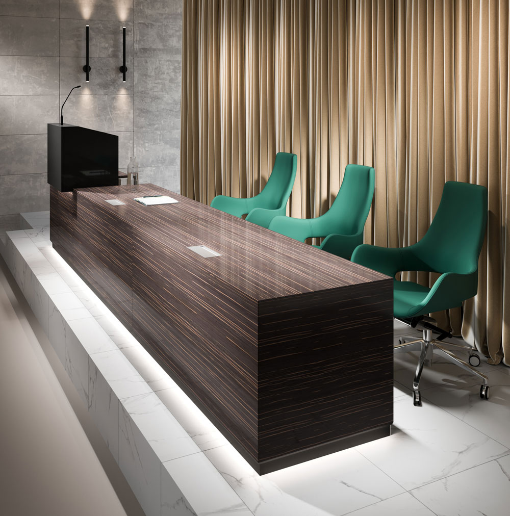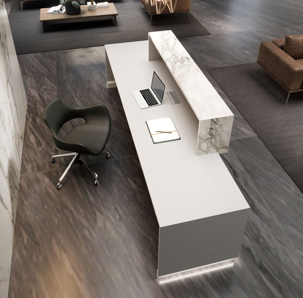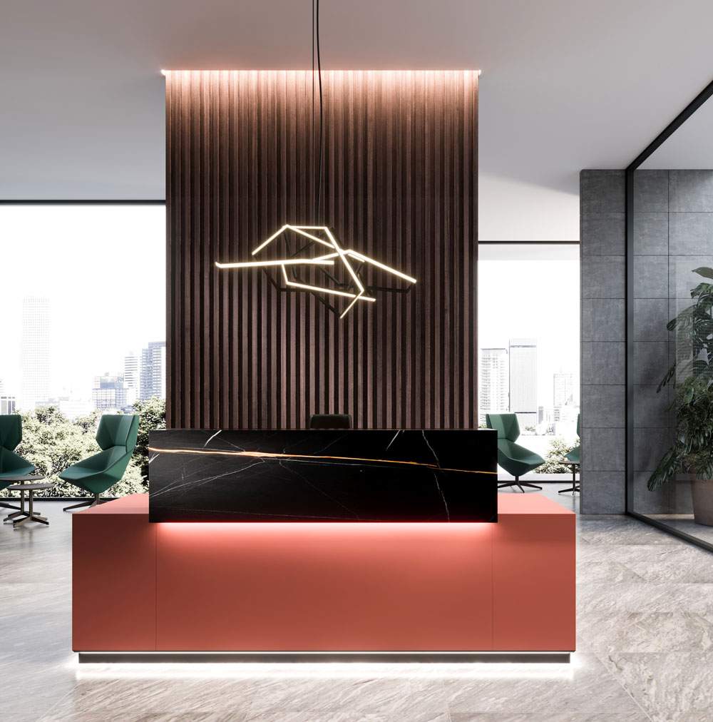 | Specs | A modern counter crafted from 25mm high-quality MDF with painted, veneer or ceramic-clad finishes, featuring durable metal beams, integrated cable management, adjustable ABS glides, and warm LED lighting for a sleek and functional design. |