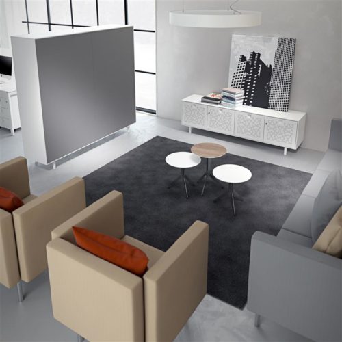 Specs | Multiple heights and forms coffee tables manufactured using metal and wood with special glides for floor protection. |