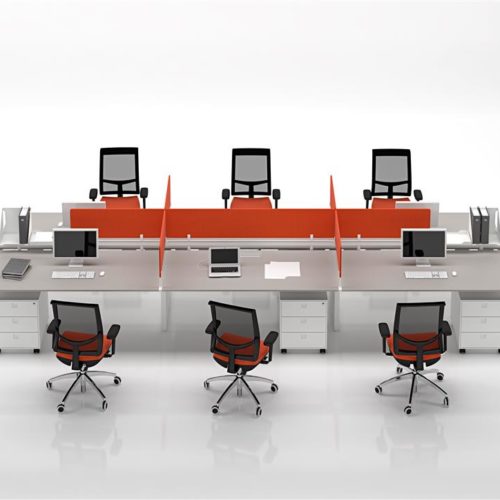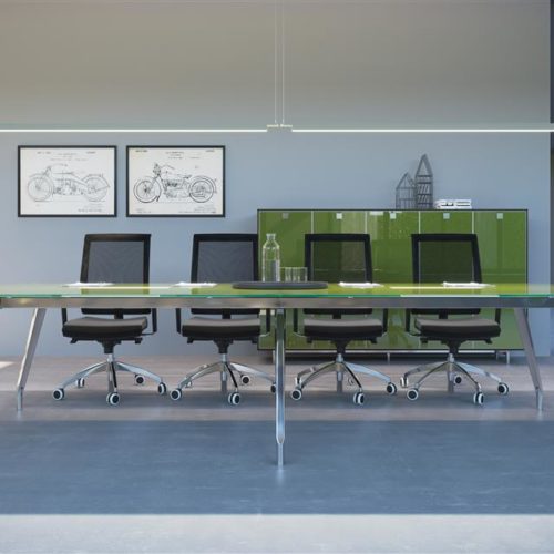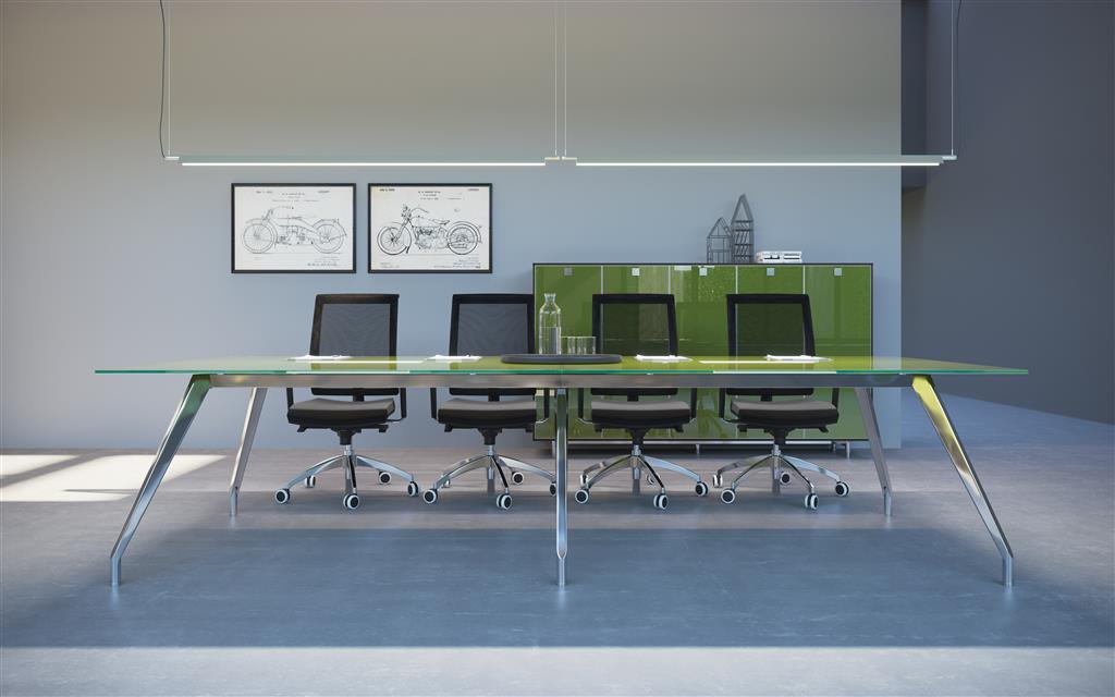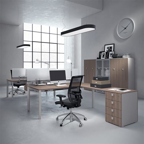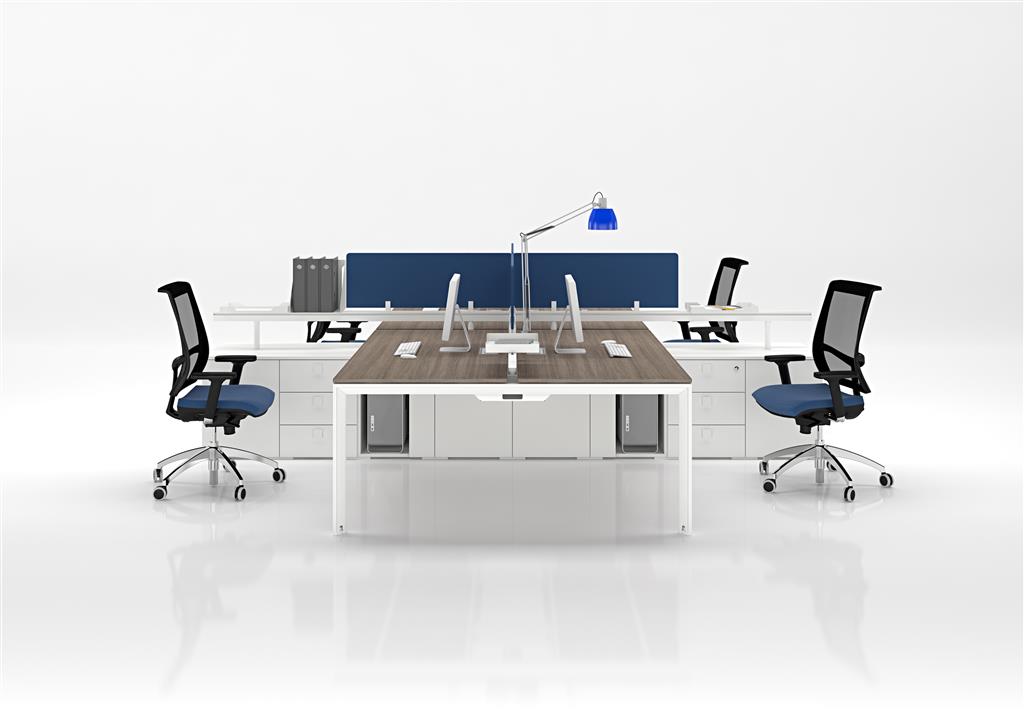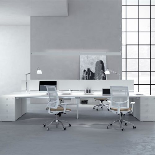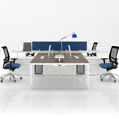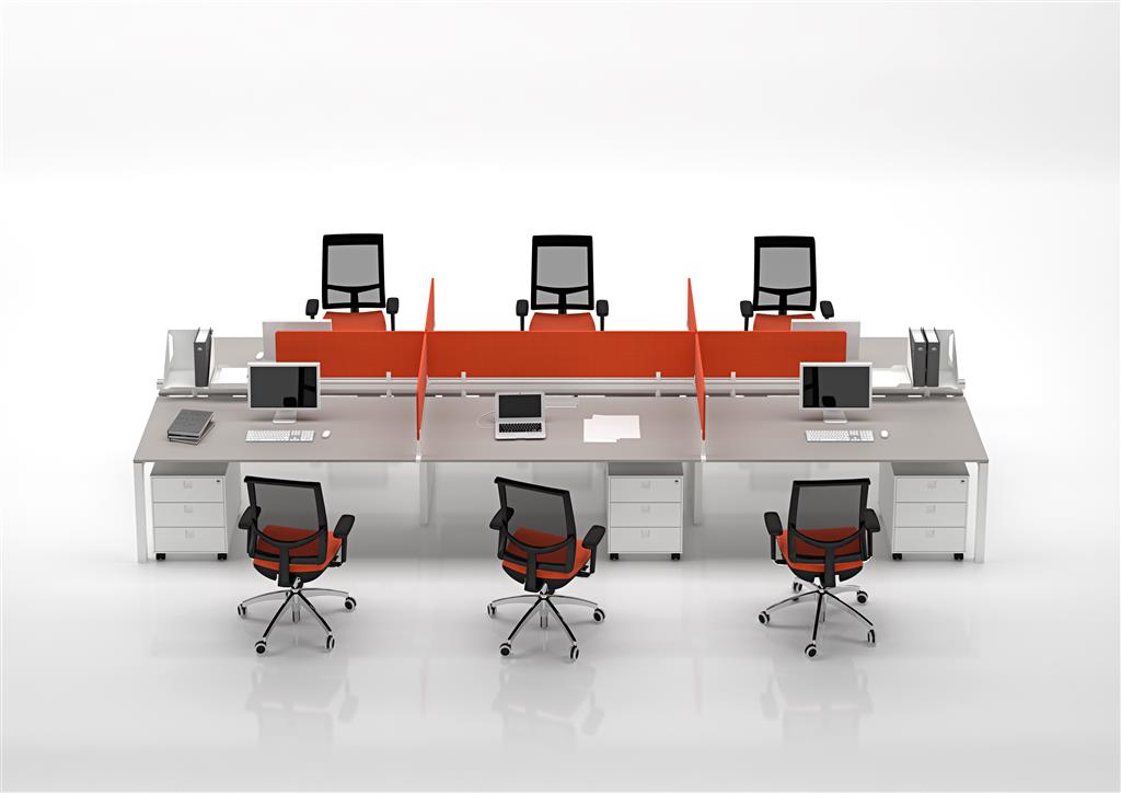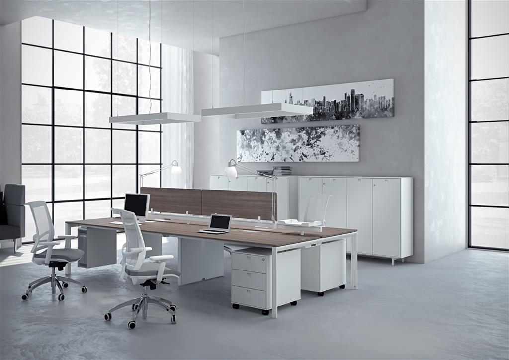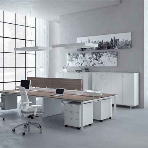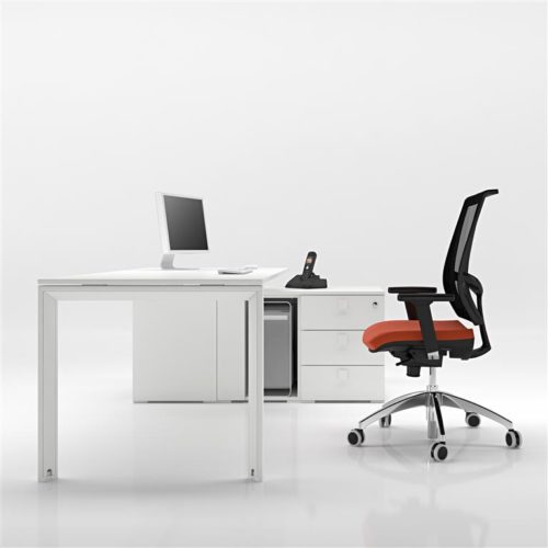A modern desk manufactured using wood tops or glass tops, and metal legs that can be opened for cable management solutions for clear workspace, with high quality western European accessories.