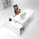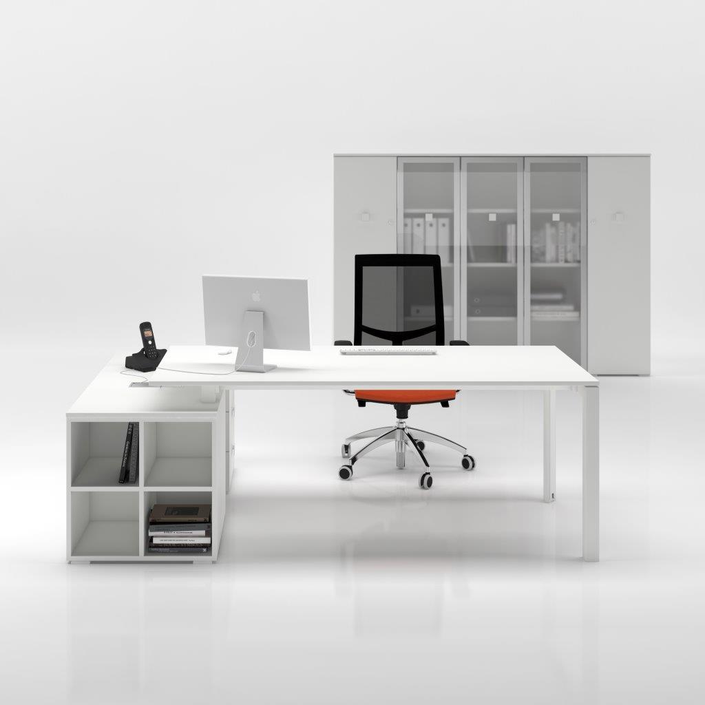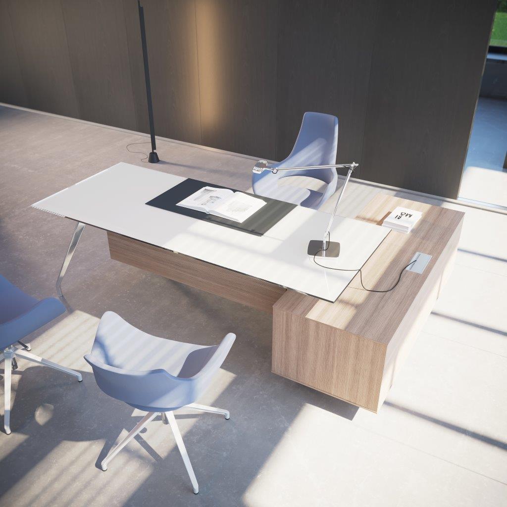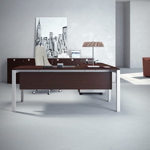 Desk Specs | A modern desk manufactured using wood tops and metal legs that can be opened for cable management solutions for clear workspace, with high quality western European accessories. Wood top thickness 18 mm. |