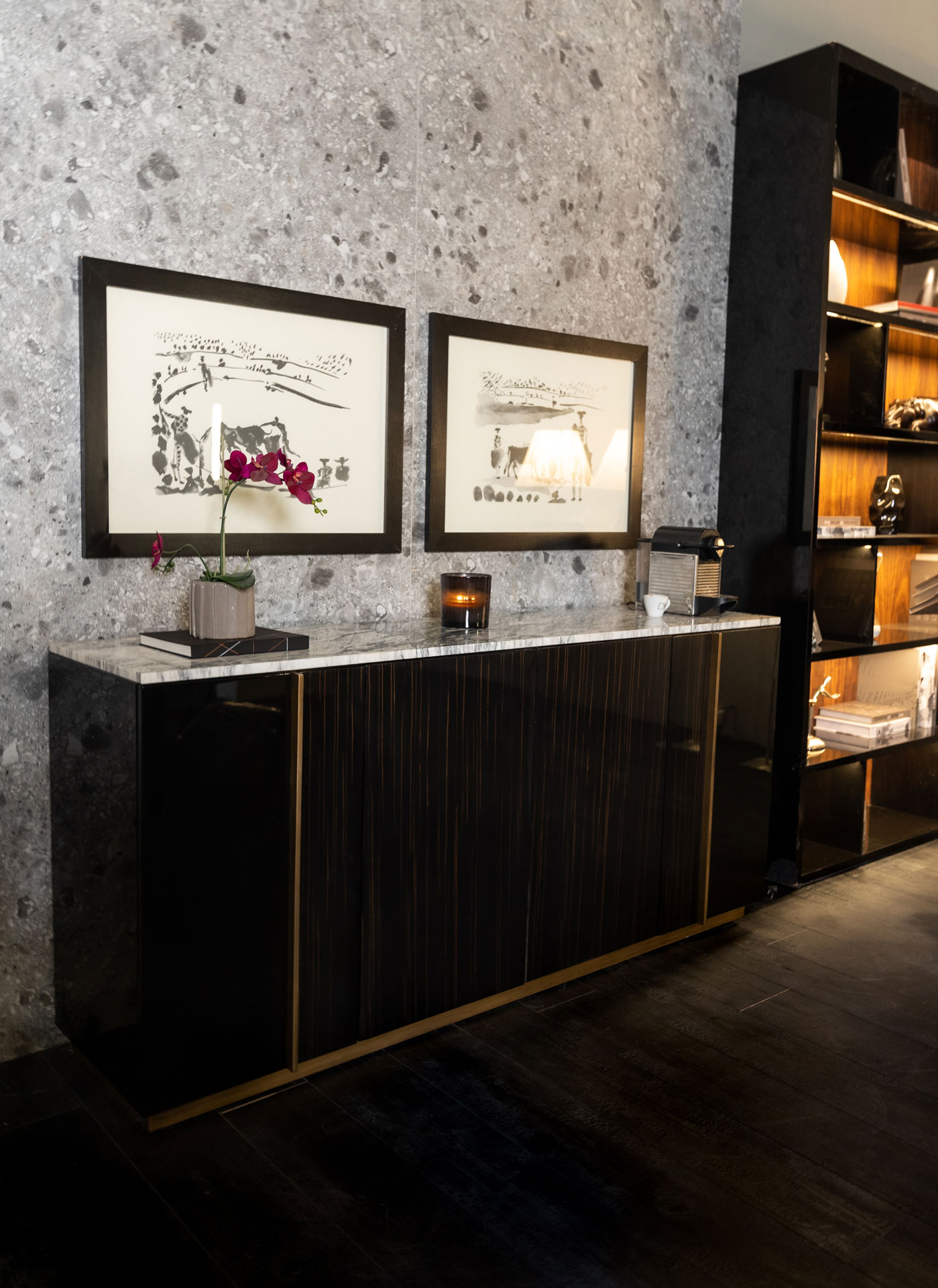 Specs | Made of 18 mm MDF lacquered or veneered in a high gloss finish, provided with internal lighting, sensors and push to open doors. The cabinet is provided with adjustable feet of 10 mm. |